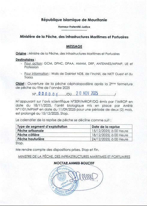 أعلنت وزارة الصيد أن استئناف أنشطة الصيد سيكون على مراحل خلال شهر ديسمبر المقبل، حيث تقرر استئناف الصيد التقليدي في 15 ديسمبر، يليه الصيد الشاطئي في 18 من الشهر ذاته، فيما يبدأ الصيد الصناعي في 24 ديسمبر بمدينة نواذيبو.