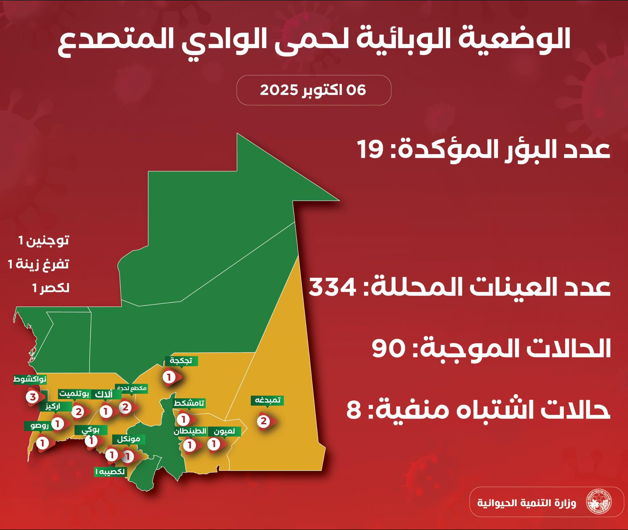 وأوضح بيان صادر عن الوزارة أن أولى البؤر سُجلت يوم 15 سبتمبر 2025 في قرية الشام التابعة لبلدية دار البركة بمقاطعة بوكي في ولاية لبراكنه، مشيرة إلى أن المصالح البيطرية واصلت عمليات الرصد حتى يوم 5 أكتوبر الجاري، لتصل الحصيلة إلى 19 بؤرة مؤكدة.